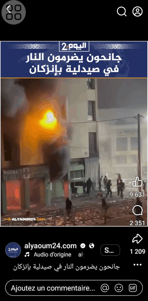 إضافة إلى إضرام النار وإلحاق أضرار جسيمة بـ 142 عربة تابعة للقوات العمومية و20 سيارة تابعة للخواص. كما اقتحم المحتجون عددا من الإدارات والمؤسسات والوكالات البنكية والمحلات التجارية وقاموا بأعمال نهب وتخريب بداخلها، بكل من آيت اعميرة بإقليم اشتوكة – آيت باها، وإنزكان – آيت ملول وأكادير – إداوتنان وتيزنيت ووجدة. الأمر تعدى ذلك إلى قيام بعض المحتجين بمدينة وجدة باعتراض سيارة إسعاف تابعة للوقاية المدنية ومنعها من تقديم المساعدة ونقل الأشخاص المصابين.وتفصيلا لما سبق تم تسجيل ب:عمالة إنزكان – آيت ملول: إصابة 69 عنصرا من أفراد القوات العمومية، وإلحاق أضرار بـ 3 سيارات تابعة لهاته القوات و4 سيارات تابعة للخواص. بالإضافة إلى 3 وكالات بنكية ووكالة للتأمين وصيدلية ومجموعة من المحلات التجارية.عمالة وجدة – أنجاد: إصابة 51 عنصرا وإلحاق أضرار بـــ 40 سيارة، ومحلين تجاريين.عمالة الصخيرات – تمارة: إصابة 44 عنصرا وإلحاق أضرار بـــ 47 سيارة تابعة للقوات العمومية، و13 سيارة تابعة للخواص.إقليم بني ملال: إصابة 28 عنصرا، و7 سيارات تابعة للقوات العمومية.إقليم الرشيدية: إصابة 13 عنصرا، وإلحاق أضرار بـ 8 سيارات.إقليم بركان: إصابة 10 عناصر، وإلحاق أضرار بـ 12 سيارة تابعة للقوات العمومية.إقليم تيزنيت: إصابة 8 عناصر، وإلحاق أضرار بسيارة واحدة خاصة.إقليم القنيطرة: إصابة 8 عناصر.إقليم اشتوكة – آيت باها: إصابة 5 عناصر، وإلحاق أضرار بــ 12 سيارة تابعة للقوات العمومية وأخرى خاصة.عمالة الرباط: إصابة 5 عناصر.إقليم كلميم: إصابة 5 عناصر، وإلحاق أضرار بسيارة واحدة.إقليم الناضور: إصابة 4 عناصر، وإلحاق أضرار بـ 10 سيارات تابعة للقوات العمومية.إقليم خنيفرة: إصابة 4 عناصر.عمالة مكناس: إصابة 4 عناصر، وإلحاق أضرار بسيارة واحدة تابعة للقوات العمومية.إقليم ورزازات: إصابة عنصرين.عمالة الدار البيضاء: إصابة عنصرين، وإلحاق أضرار بسيارة واحدة خاصة.إقليم تارودانت: إصابة عنصر واحد، وإلحاق أضرار بسيارة واحدة.وقد جرى التعامل، وفق القانون، مع الأشخاص الذين أصروا على خرق الترتيبات الأمنية، حيث أخضع البعض لإجراءات التحقق من الهوية تحت إشراف النيابة العامة، ليطلق سراحهم مباشرة بعد استكمال المسطرة القانونية، فيما تم وضع 409 شخصا تحت تدابير الحراسة النظرية بتعليمات من النيابة العامة المختصة.هذا، وكانت بعض مناطق المملكة قد شهدت خلال الأيام الأخيرة تنظيم أشكال للتظاهر والتجمهر بالشارع العام، تمت خارج الإطار القانوني، استجابة لدعوات مجهولة المصدر عبر وسائل التواصل الاجتماعي، حيث تدخلت القوات العمومية لفض هذه التجمعات، بشكل حرصت فيه على الاحترام التام للمقتضيات القانونية والضوابط المهنية التي تحكم عملها. وإذ تحرص وزارة الداخلية على توضيح هذه المعطيات للرأي العام الوطني، فإنها تؤكد في المقابل على أن السلطات العمومية ظلت وستبقى ملتزمة بأداء واجبها بروح من المسؤولية في صون النظام العام، وضمان ممارسة الحقوق والحريات، بما في ذلك حرية التظاهر السلمي، في نطاقها المشروع وضمن الأطر القانونية المحددة. وستواصل، بما تفرضه المسؤولية المؤسساتية، إجراءات حماية الأمن والنظام العامين، بما يقتضيه ذلك من تحفظ وضبط للنفس وعدم الانسياق وراء الاستفزازات من جهة، وبما يتطلبه ذلك من احترام دقيق للنصوص القانونية والضوابط المهنية من جهة ثانية.كما وجب التأكيد على أنه سيتم التعامل، بكل حزم وصرامة ووفقا للمقتضيات القانونية النافذة، مع كل الأشخاص الذين يثبت ارتكابهم لأفعال أو تصرفات تقع تحت طائلة القانون، مع ترتيب جميع المسؤوليات والآثار القانونية على ضوء الإجراءات والمساطر القضائية وتحت إشراف النيابة العامة المختصة. 1-10-2025