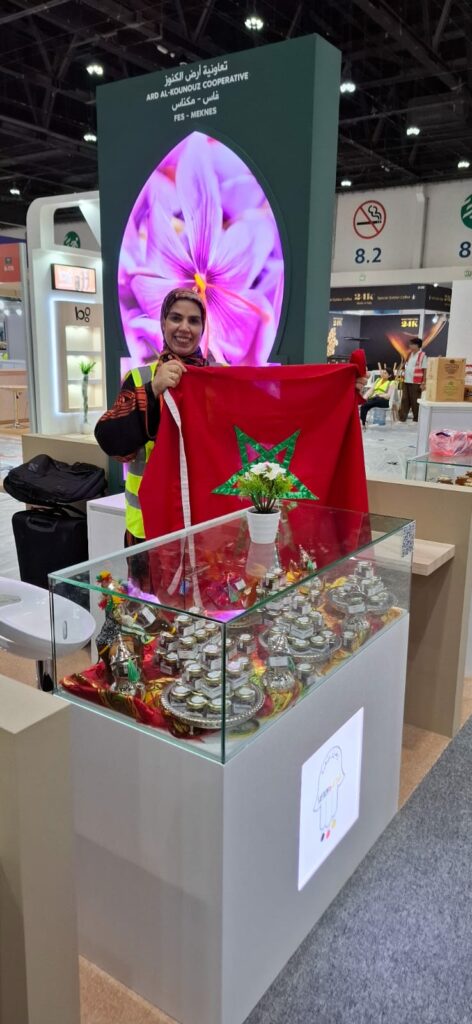 فاطمة حنيني المرأة منتجةالزعفران خارج تاليوين ترفعت راية المغرب في أبوظبي في أروقة معرض أبو ظبي الدولي للمنتجات الغذائية بالإمارات العربية المتحدة.