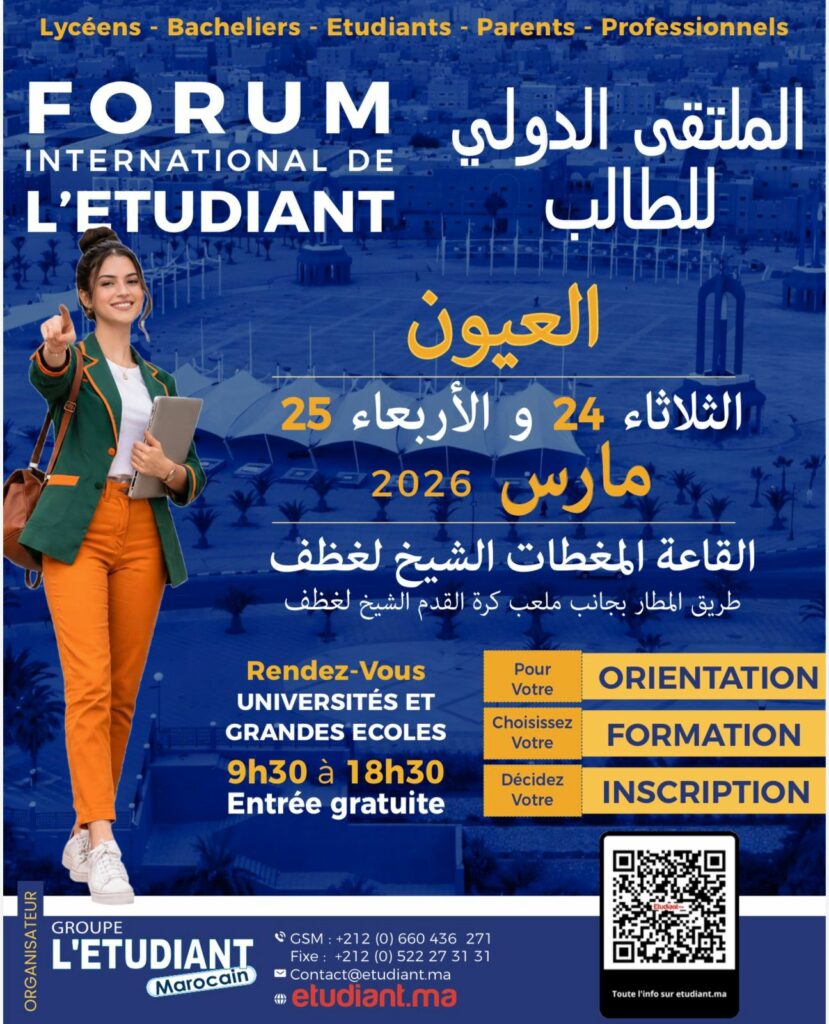 ضمن جولته بعدد من مدن وجهات المملكة الملتقى الدولي للطالب يحط الرحال بمدينة العيون يومي 25/24 مارس الجاري بالقاعة المغطاة الشيخ لغظف.تلاميذ الباكالوريا الطلاب وأولياء أمورهم سيكونون على موعد مع أكبر فرصة للتوجيه والإرشاد، حيث بانتظارهم أروقة تمثل جامعات ومدارس وطنية ودولية منها الخاصة والعمومية. سيعرف المعرض كذلك حضور خبراء في التوجيه ما يوفر للزوار إمكانية لقاءات مباشرة مع الموجهين للإجابة على كل استفساراتهم بشكل مباشر .معرفة ميولات الطالب ومؤهلاته وأخذها بالاعتبار في تكوينه الدراسي يبقى السبيل نحو إنجاح المسار الأكاديمي ما يساهم في دخول سهل إلى عالم الشغل.وهذا ما تسعى له مجموعة الطالب المغربي من خلال تنظيم هذا الملتقى.الراغبون في إكمال الدراسة بالخارج، المهتمون بالجامعات أو المدارس العليا، الطامحون في ولوج التكوين المهني ..الملتقى الدولي للطالب أفضل سبيل لتحديد الاختيار الأنسب بحرصه على توفير كل الاختيارات رغم اختلافها عند الطلبة.مدارس تعليم اللغات ومكاتب الخدمات ستكون حاضرة كذلك بهذا الملتقى الدولي الذي يفتح أبوابه مجانا من التاسعة والنصف صباحا حتى السادسة والنصف مساء في وجه التلاميذ والطلبة وأولياء أمورهم.