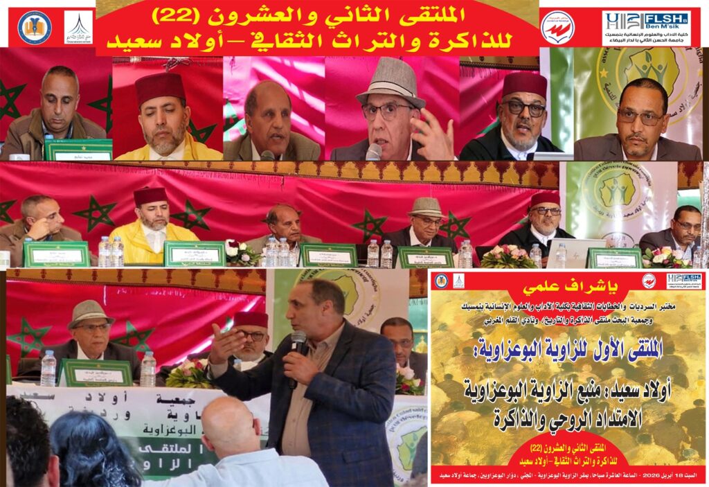 احتضن مقر الزاوية البوعزاوية بـ “المجني” في منطقة أولاد سعيد، يوم السبت 18 أبريل 2026، فعاليات الملتقى 22 للذاكرة والتراث الثقافي، دورة أولاد سعيد بإشراف علمي لمختبر السرديات وجمعية البحث ملتقى الذاكرة والتاريخ ونادي القلم المغربي، وضمن الدورة الأولى للزاوية البوعزاوية وتنظيم جمعية أولاد سعيد الشاوية في موضوع (الزاوية البوعزاوية، الامتداد الروحي والذاكرة).وفي كلمته عن اللجنة العلمية للملتقى، وقف الأستاذ إدريس قصوري (جامعة الحسن الثاني-مختبر السرديات) عند سؤال جوهري: كيف ندافع عن هويتنا وقيمنا إن لم نعرف تاريخنا؟ وأكد أن معرفة الماضي ليست رفاهية فكرية وإنما هو ضرورة حياتية، مشيرا إلى أن الزاوية البوعزاوية أدركت هذا قبل أن تظهر المدرسة النظامية، فكانت فضاء للتعليم والتربية وغرس القيم. وتوقف عند دلالة الريشة والقلم، مبينا أنهما لم يكونا منفصلين عن الجهاد، إذ لا كفاح بلا وعي ولا دفاع عن الهوية بلا معرفة بالأصول. ورأى أن منهج الشيخ البوعزاوي كان متكاملا، جمع فيه بين الفقه والتصوف وبين العلم والعمل، مخرجا التصوف من العزلة إلى الانخراط في قضايا الوطن.وفي الجلسة العلمية التي أدارها الأستاذ نور الدين فردي (باحث متخصص في تاريخ منطقة الشاوية)، كان الحديث عن المكان أولا.. إذ أكد أن فضاء” المجني” شاهد على انتفاضات شعبية انطلقت منذ 1903، وعلى قرارات عسكرية حاسمة لمواجهة الاحتلال، وكان مقرا للحركة الحافظية في لحظات فارقة. ثم استهل الأستاذ حكيم الفضيل الإدريسي ( جامعة الحسن الثاني بالدار البيضاء) أشغال الجلسة العلمية بورقة بحثية تناولت أعماق أصول علم التزكية في التجربة الصوفية المغربية. وقد أوضح الأستاذ في عرض مفعم بالاستدلال أن التصوف في مسارنا المغربي لم يكن يوما بمعزل عن أحكام الدين، بل قام تاريخيا على معادلة دقيقة تجمع بين ظاهر الشريعة المنضبط وباطنها الذي يغذي الروح، جاعلا الغاية الكبرى من هذا المسار هي تربية النفوس وتطهير القلوب من أدرانها. وتوقف الباحث عند شخصية الشيخ البوعزاوي، مبرزا أنه كان حلقة وصل في سلسلة ذهبية تحمل سندا متصلا يمتد من شيخ إلى شيخ حتى الوصول إلى حضرة النبي صلى الله عليه وسلم، مشددا على أن هذا السند ليس مجرد أسماء تسرد، بل هو نقل حي لنبض التجربة الروحية التي توارثتها الأجيال بصدق وإخلاص. وفي لفتة تربوية بالغة الأهمية، وأكد الفضيل الإدريسي أن الطالب الذي يطرق أبواب هذه الطريقة لا يمكنه سلوك المسار وحيدا، بل هو في حاجة ماسة الى مرب خبير يأخذ بيده في دروب التزكية الوعرة. وختم مداخلته بالقول إن هذا العلم لا يستقى من بطون الكتب الجامدة، بل هو جوهرة لا تنال إلا بالتلقي المباشر عن شيخ رباني عاش التجربة بنفسه وأتقن مفاتيحها ليورثها لمريديه.وتناول الأستاذ الجيلالي كريم، ( أستاذ باحث في التاريخ)، تراث الشيخ محمد بن الطيب البوعزاوي، مصوبا اهتمامه نحو البعد الوجداني العميق في حياته وتعلقه الفريد بالسيرة النبوية. وأوضح الباحث أن الشيخ الذي ولد حوالي سنة 1850 وعاصر خمسة ملوك في حياته، عاش في فترة دقيقة من تاريخ المغرب، وكان مسكونا بحب النبي صلى الله عليه وسلم، وهو حب لم يكن عاطفة عابرة بل كان الوقود الذي أشعل فيه جذوة الإبداع. وقد أفرز هذا الوجد الصادق قصائد مدحية مهمة وظفها الشيخ منهجا تربويا متكاملا لتهذيب نفوس مريديه وتخليصها من علائق الدنيا، حيث جعل المحبة النبوية هي الميزان الذي تضبط به القلوب إيقاعها. ومن أبرز ما خلد ذكراه هو همزيته الشهيرة في مدح النبي، تلك القصيدة التي لا تزال تحفظها الصدور والأجيال حتى اليوم وتتردد في مجالس الذكر. وأكد الأستاذ كريم أن هذه الهمزية ليست مجرد نصوص أدبية، بل هي مرآة تعكس عمق ارتباط الشيخ بالجناب النبوي الشريف، وكيف استطاع أن يجعل من محبة الرسول محورا أساسيا لتربية المريدين وتنشئتهم روحيا ووجدانيا، مما جعل تجربته الشخصية نموذجا حيا يربط الأتباع بسيرة المصطفى صلى الله عليه وسلم في كل تفاصيل حياتهم اليومية وسلو